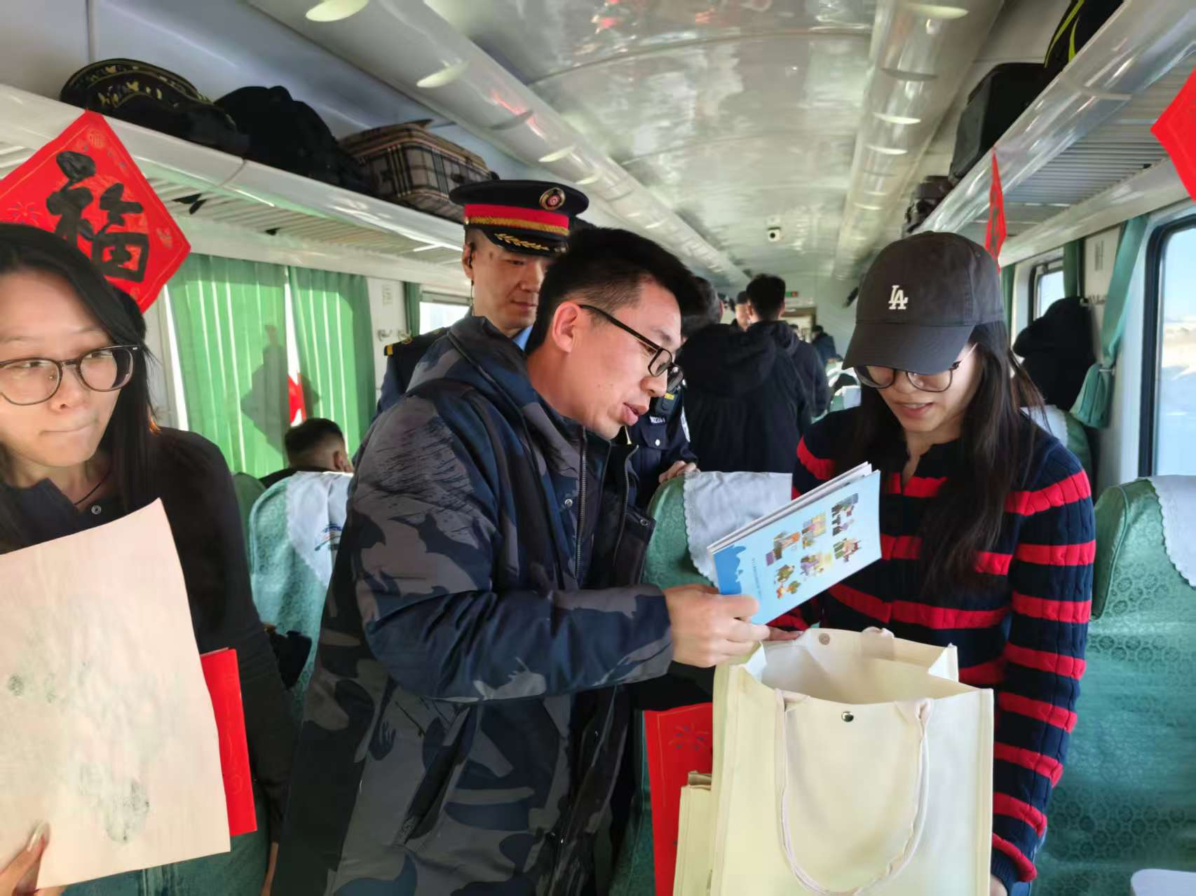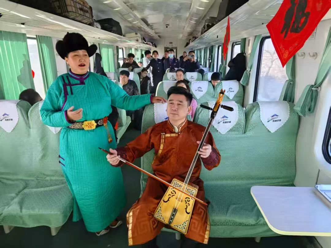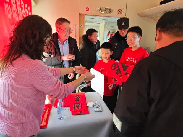 活动现场还开展了知名书法家及书法志愿者现场为旅客书写、赠送春联和“福”字,乌兰牧骑马头琴演奏家、长调民歌演唱者,为旅客进行小型文艺表演等活动。