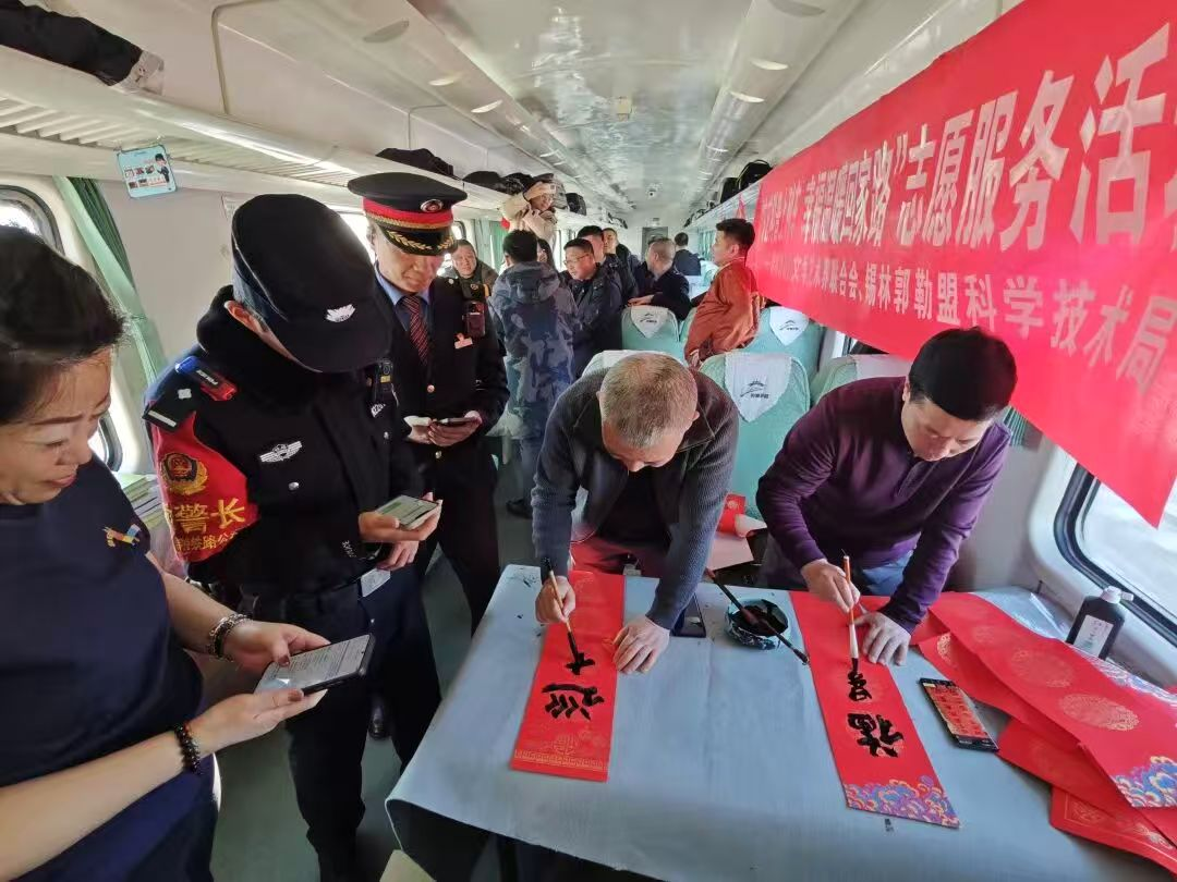 为深入实施自治区科普能力提升建设项目,推进全民科学素质提升行动,创新科普服务场景,让科普更贴近群众、贴近春运、贴近生活,2026年2月10日(农历腊月二十三),正值传统小年,由十大博彩公司官方网站联合盟文联、书法家协会、文艺志愿者协会、乌兰牧骑,锡林浩特铁路公安处锡林浩特站派出所在锡林浩特至桑根达来往返的列车上开展“文艺科普上列车 幸福温暖回家路”主题科普服务活动,把流动车厢变成移动科普课堂,以文艺赋能科普、以科普温暖归途。活动紧扣春运出行与民生需求,聚焦安全出行、健康防护、生活常识等群众关心的科普内容,通过“科普活动+文艺表演+知识问答+笔墨送福”等形式,让旅客在旅途间隙轻松学科学、用科学。