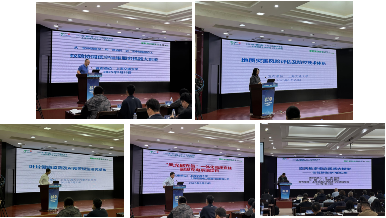 在成果发布环节,上海交通大学5位专家学者集中推出一批前沿实用的创新成果,覆盖绿色能源、智能装备等关键领域:顿向明教授发布的“蚁鹞协同低空运维服务机器人系统”,为“抵近难”“观测难”“操作难”低空无人运维场景的刚需提供高效智能解决方案;车爱兰教授带来的“地质灾害风险评估及防控技术体系”,可筑牢区域环境与生产安全屏障;电子信息与电气工程学院姚刚教授推出的“风光储充一体化电站项目(高压直挂超级充电站)”,助力构建新型电力系统;田书铭研究员的“叶片健康监测及AI预警模型研究”,为风电设备安全高效运行提供技术保障;自动化与感知学院方涛教授团队发布的“空天地多模态遥感大模型在智慧牧草中的应用”,精准赋能当地特色农牧业升级。
