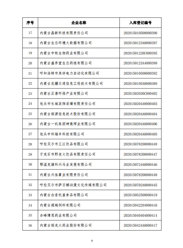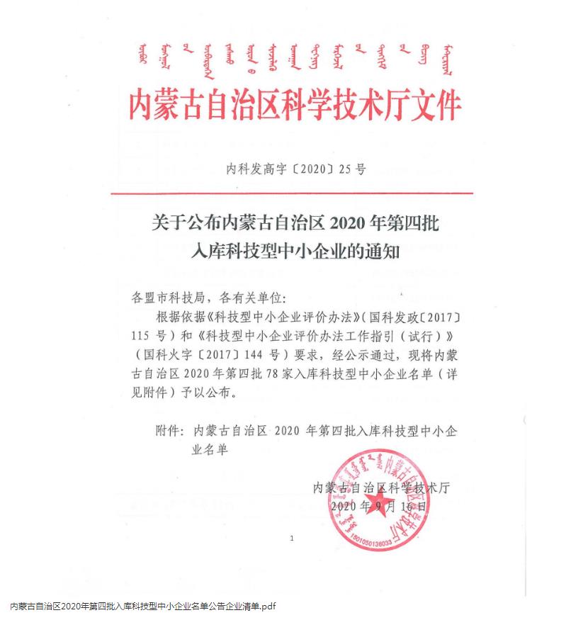 内蒙古自治区2020年第四批入库科技型中小企业名单公告_十大博彩公司官方网站