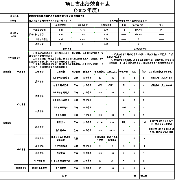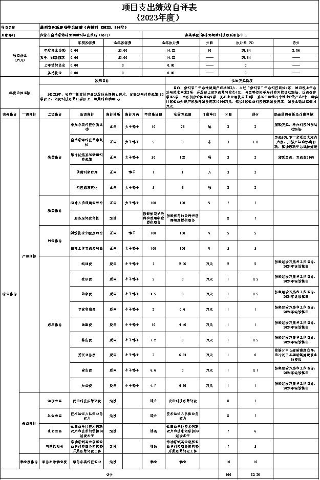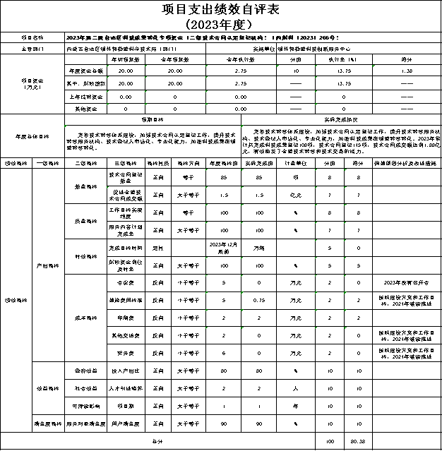 ③“2023年第二批自治区科技成果转化专项资金(二级技术合同认定登记机构)”自评综述:根据年初设定的绩效目标,项目自评得分80.38分。该项目总预算20万元,2023年支出2.75万元,完成预算的13.75%。项目绩效目标实际完成情况: 完善技术转移体系建设,加强技术合同认定登记工作,提升技术转移服务机构、技术经纪人市场化、专业化能力,加速科技成果在锡盟转移转化。2023年累计共完成科技成果登记108项,技术合同登记145项,技术合同成交额达到1.88亿元,有效激发了全盟技术转移和技术交易的活力。