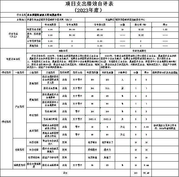 以“企业科技特派员工作站建设项目”为例,该项目绩效评价综合得分为92.49分,绩效评价结果为“优”。现将该项目单位评价报告进行公开,具体如下: