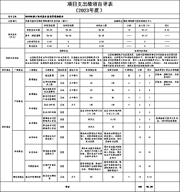 ⑤“2021年第二批自治区科技成果转化专项资金(21结转)”自评综述:根据年初设定的绩效目标,项目自评得分97.38分。该项目总预算20万元,2021年支出4.32万元,2022年支出6.34万元,2023年支出7.46万元,完成预算的90.60%。项目绩效目标实际完成情况: 1、已完成技术合同认定登记145项,合同成交额达1.88亿元,已超额完成工作任务。2、发挥桥梁纽带作用,积极推动各市场主体、高等院校、科研院所、众创载体、中介服务机构互通互联,切实提高全盟科技成果转化效能。