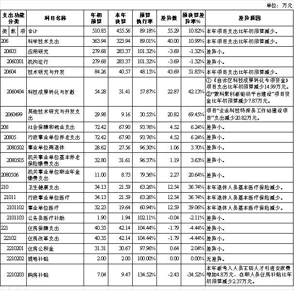 科学技术支出决算数为 323.94万元,年初预算 363.94万元,完成年初预算的89.01%,相比减少40万元,下降10.99%。决算数与年初预算数的差异原因:本年项目支出减少。其中: