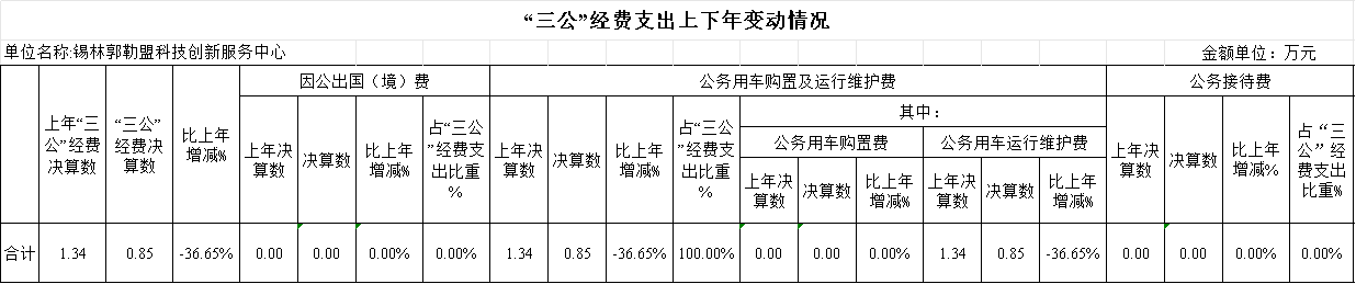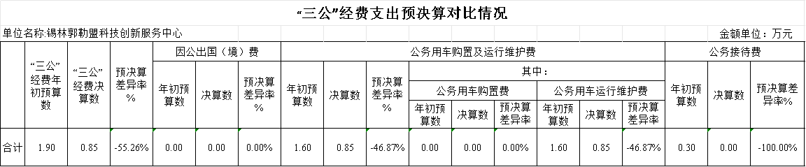 网上十大博彩公司网站科技创新服务中心单位 2024年度财政拨款“三公”经费全年预算0.85万元,支出决算0.85万元,完成预算的100%。其中:因公出国(境)费预算0.00万元,支出决算0.00万元,完成预算的0.00%;公务用车购置及运行维护费预算0.85万元,支出决算0.85万元,完成预算的100.00%;公务接待费预算 0 万元,支出决算0.00万元,完成预算的0.00%。