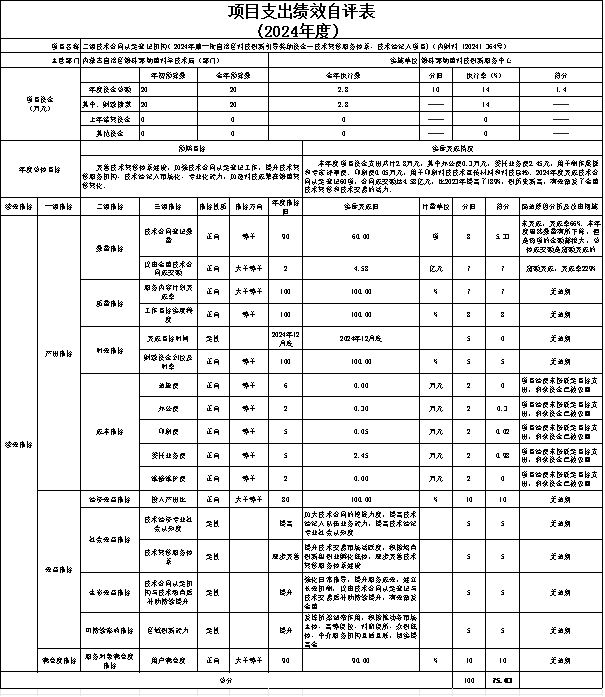 ⑤二级技术合同认定登记机构(2024年第一批自治区科技创新引导奖励资金--技术转移服务体系、技术经纪人项目)(内财科〔2024〕364号)自评综述:根据年初设定的绩效目标,项目自评得分75.03分。该项目总预算20万元,2024年支出2.80万元,执行率14%。