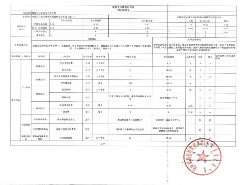 2.盟派科技特派员工作经费项目自评综述:根据年初设定的绩效目标,项目自评得分92.93分。全年预算数为8.16万元,执行数为6.47万元,完成预算的79.29%。项目绩效目标完成情况:赴呼和浩特市、乌兰察布市、鄂尔多斯市考察学习科技特派员工作。举办“全盟科技特派团工作会议暨能力素质提升培训班。在西乌旗浩勒图高勒镇举办“科技助力乡村振兴”暨农牧业实用技术培训班等。发现的主要问题及原因:预算执行率较低。下一步改进措施:进一步优化预算编制的合理性及科学性,及时调整全年工作安排。